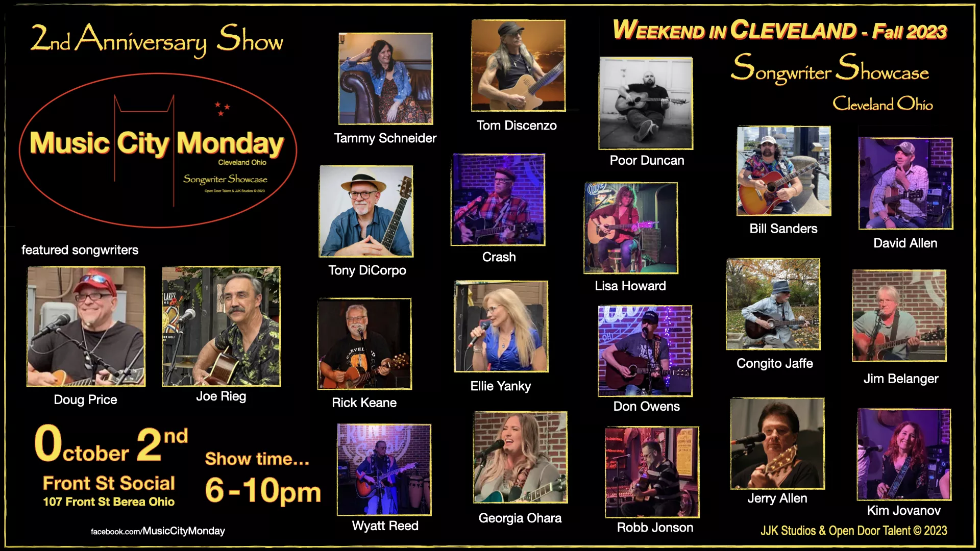As part of the Weekend in Cleveland Fall 2023 series - Music City Monday celebrates their 2nd Anniversary October 2nd at the Front St Social in Berea Ohio... Joe Rieg & Doug Price host the event that features 7 rounds that include 20 songwriters presented by JJK Studios and Open Door Talent - many thanks out to all that keeps our musical adventure alive ...