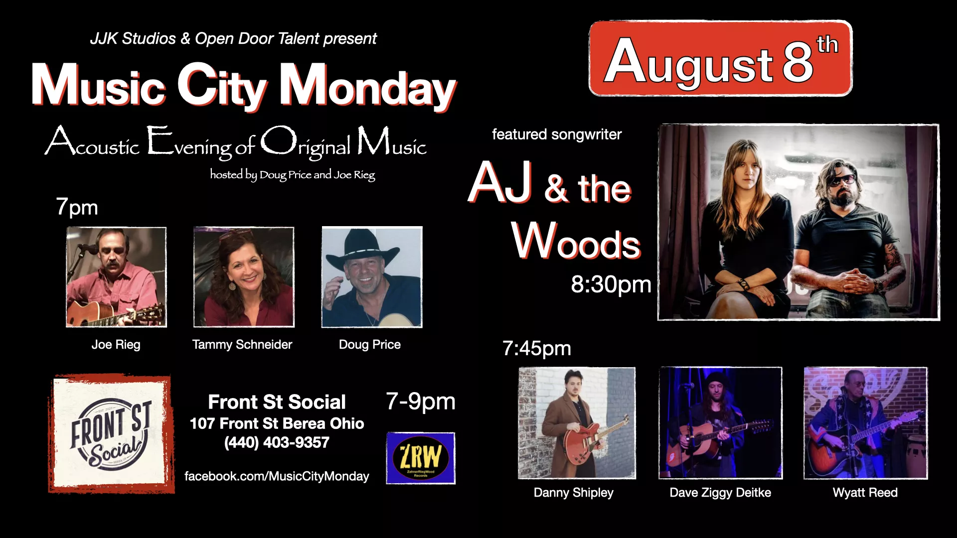 JJK Studios and Open Door Talent are proud to present Music City Monday at the Front St Social in Berea Ohio. The Songwriter Showcase hosted by Joe Rieg and Doug Price welcomes this months featured songwriters AJ & the Woods along with local writers Danny Shipley, Dave "Ziggy" Deitke, Wyatt Reed and Tammy Schneider ... bookings: jjkstudioinfo@gmail.com