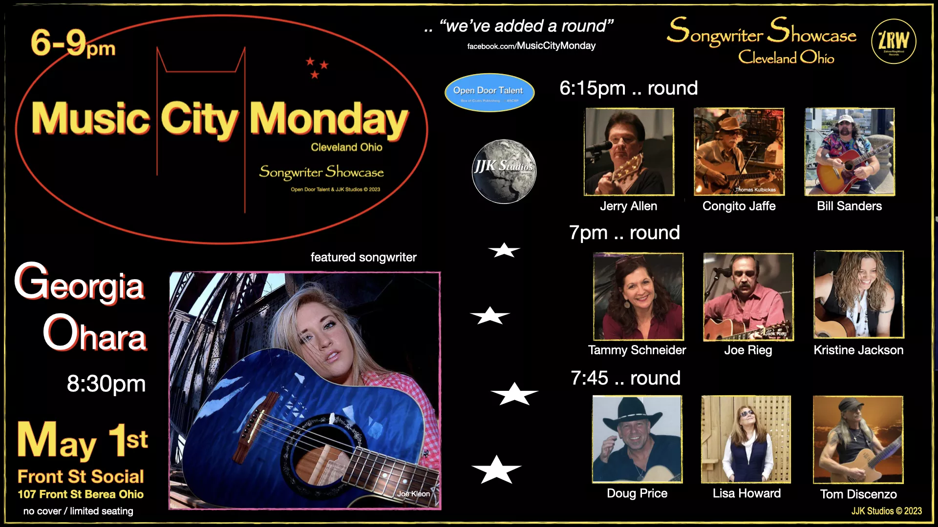 JJK Studios and Open Door Talent is proud to announce the May 1st MCM lineup ... with more songwriters requesting to be part of the showcase, the show will now start at 6:15 with an additional round being added to the evening ... 6:15... Jerry Allen / Congito Jaffe / Bill Sanders .. 7:00... Tammy Schneider / Joe Rieg / Kristine Jackson .. 7:45... Doug Price / Lisa Howard / Tom Discenzo .. 8:30... featured songwriter - Georgia Ohara .. no cover / limited seating .. www.joerieg.com .. JJK Studios © 2023