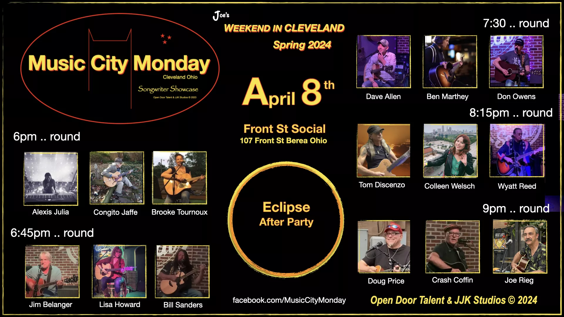 JJK Studios & Open Door Talent present Music City Monday - "Eclipse After Party" .. April 8th at the Front St Social in Berea Ohio ... listening room songwriters showcase as part of Joe's Weekend in Cleveland 2024 season .. The Music City Monday series, now in it's 3rd season is hosted by Joe Rieg and Doug Price with local songwriters sharing their original songs in scheduled rounds ... MCM - no cover / limited seating .. if you would like to be part of a scheduled round contact Joe or Doug.. www.joerieg.com / JJK Studios © 2024