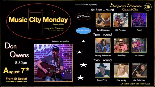 JJK Studios and Open Door Talent are proud to present... Music City Monday - August 2023 .. Our Musical Adventure continues with the next MCM Songwriters Showcase .. Joe Rieg travels up to the North Coast to co-host the showcase August 7th / 6-9pm .. 3 rounds of writers and a featured songwriter in a listening room ... 6pm ... Tom Discenzo / Bill Sanders / Crash .. 7pm ... Joe Rieg / Tammy Schneider / Lisa Howard .. 7:45 ... Doug Price / Ellie Yanky / Jim Belanger .. 8:30 ... Don Owens .. JJK Studios © 2023