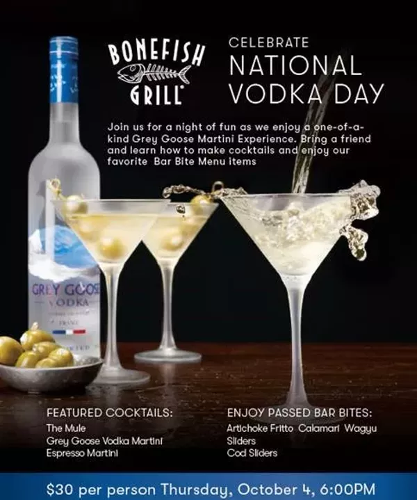 What better way to celebrate National Vodka Day than with a one-of-a-kind Grey Goose Martini Experience at the Westlake/Crocker Park Bonefish Grill (1900 Crocker Rd, Westlake, OH 44145) on Thursday, October 4 at 6 p.m. Enjoy light bar bites and learn how to shake up some of our signature hand-crafted martinis.