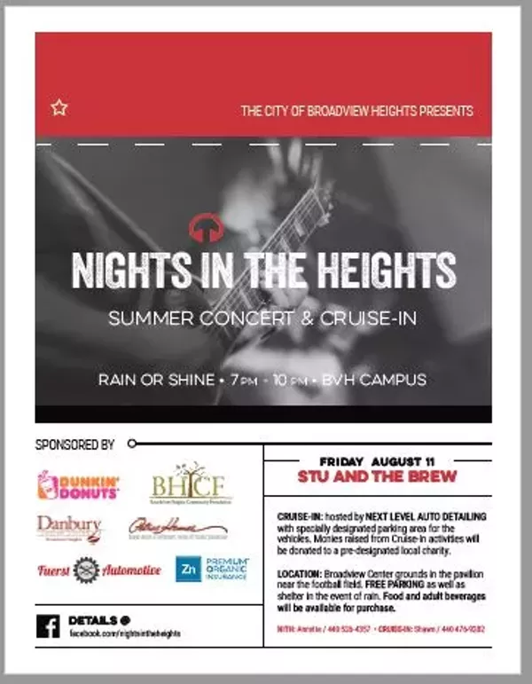 The 'Concert & Cruise In' will take place on the Broadview City grounds at the pavilion. This is the last of the summer concert series, featuring Stu and the Brew. There will be plenty of free parking as well as shelter in the event of rain. Food and adult beverages will be available for purchase.