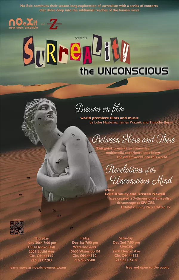 No Exit New Music's multidisciplinary exploration of Surrealism continues with a deep dive into The Unconscious! St. Paul's Zeitgeist joins the ensemble in a program that includes a fantastical multimedia experience featuring specially created surrealist musical instruments, three short art films with world-premiere live music, and an astonishing surrealist dreamscape installation at SPACES Nov 10-Dec15. Adventurous art and music lovers won't want to miss this high-sensory immersion in the fantastical and illogical realm of DREAMS.