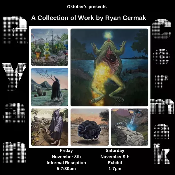 Join us along with artist, Ryan Cermak, as he displays a collection of works geared toward the arcane. Friday will be an informal reception from 5-7:30pm and Saturday will be a day long showing of his fine art collection. Please join us in celebrating this collection.