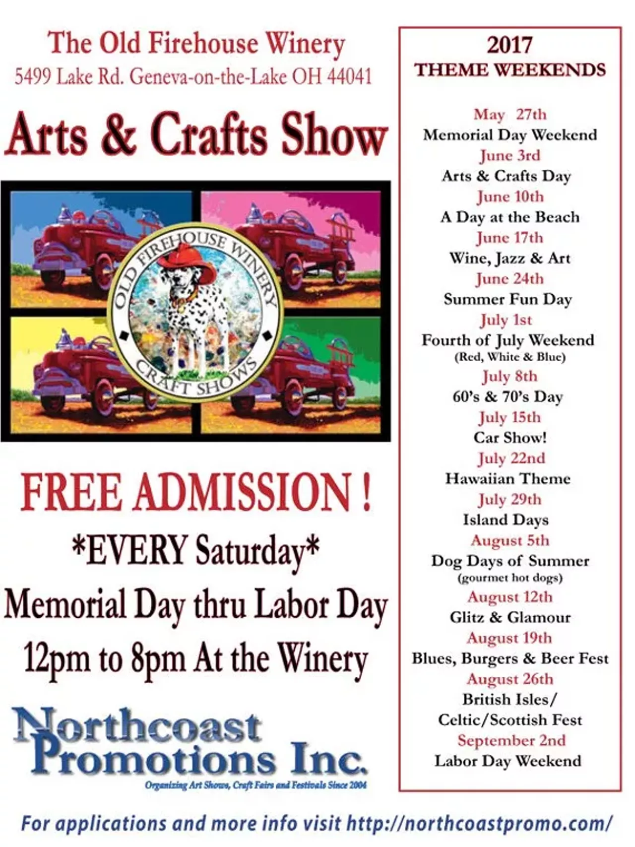 Artists/Crafts from Northeast Ohio will be located on the beautiful grounds of the Old Firehouse Winery overlooking Lake Erie – Visit our New Indoor Building - Music & Food! www.northcoastpromo.com
