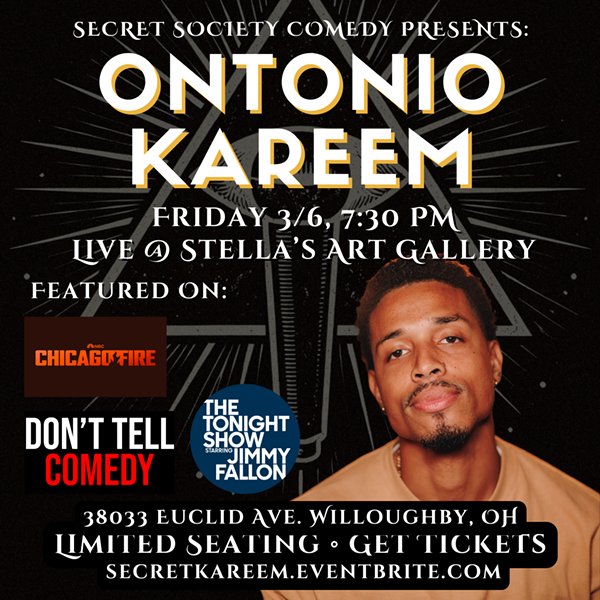 Fresh off his Tonight Show debut, Ontonio Kareem headlines an intimate, one-night stand-up comedy show inside Stella’s Art Gallery in downtown Willoughby!