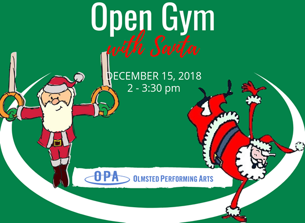 Does your child have Christmas spirit and a ton of excitement for the Christmas holiday? Bring your child to Olmsted Performing Arts where your children will bounce, swing and flip through the gym for 90 minutes with special guest, Santa! Activities will be both structured and non-structured and will include Christmas music, snowball fights and reindeer games! Your child will have a chance to talk to Santa, and you may take as many pictures as you like! December 15, 2018 from 2 – 3:30 PM $14 per child. Pre-registration is required. Limited spaces available. Parents must remain in the gym