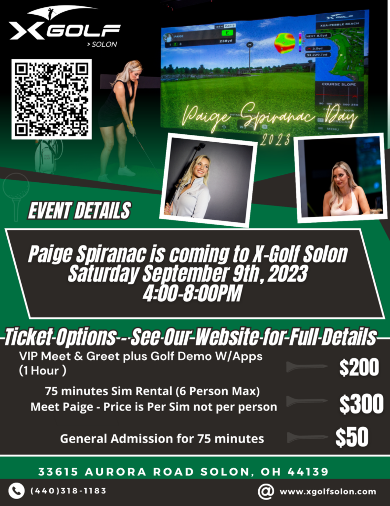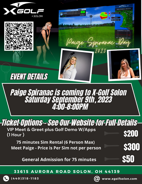 Paige Spiranac is coming to X-Golf Solon on Saturday September 9th, 2023. She will be in attendance from 4:00-8:00 PM. There are 3 different ticket options for sale now so you can interact with Paige. Space is extremely limited and will sell out so please act fast. We will have drink specials all day long!