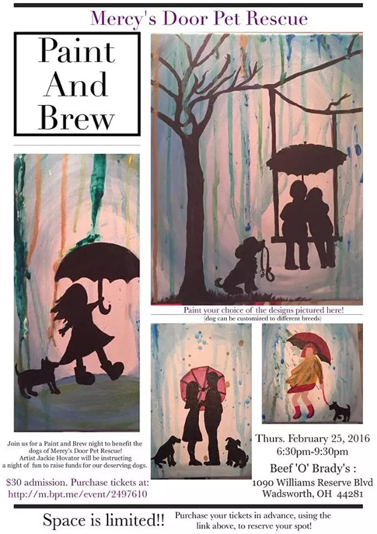 Join us for a night of fun, paint, and drinks to raise funds to provide care for the adoptable dogs of Mercy's Door Pet Rescue. Artist Jackie Hovator will be our wonderful instructor for the evening. We will be offering four different designs (pictured below) for you to paint, which are each customizable to different breeds of dog!