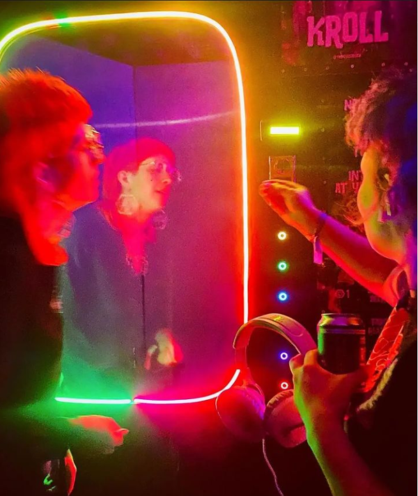 Peek-a-Booth is a pop-up performance art vending machine produced by Cassandra Harner, AKA Dusty Bucket, and Phoenix Rahmani. The booth is activated by tokens for purchase. Only two people can enter at a time and witness an intimate performance with a mystery entertainer behind the light-up window. You could find a clown, a drag queen, a dancer, a mermaid, or an entity too strange to describe. The Peek-a-Booth was awarded the Urgent Art Fund by SPACES and debuted at Ingenuity Fest in 2022. The event is 18+.