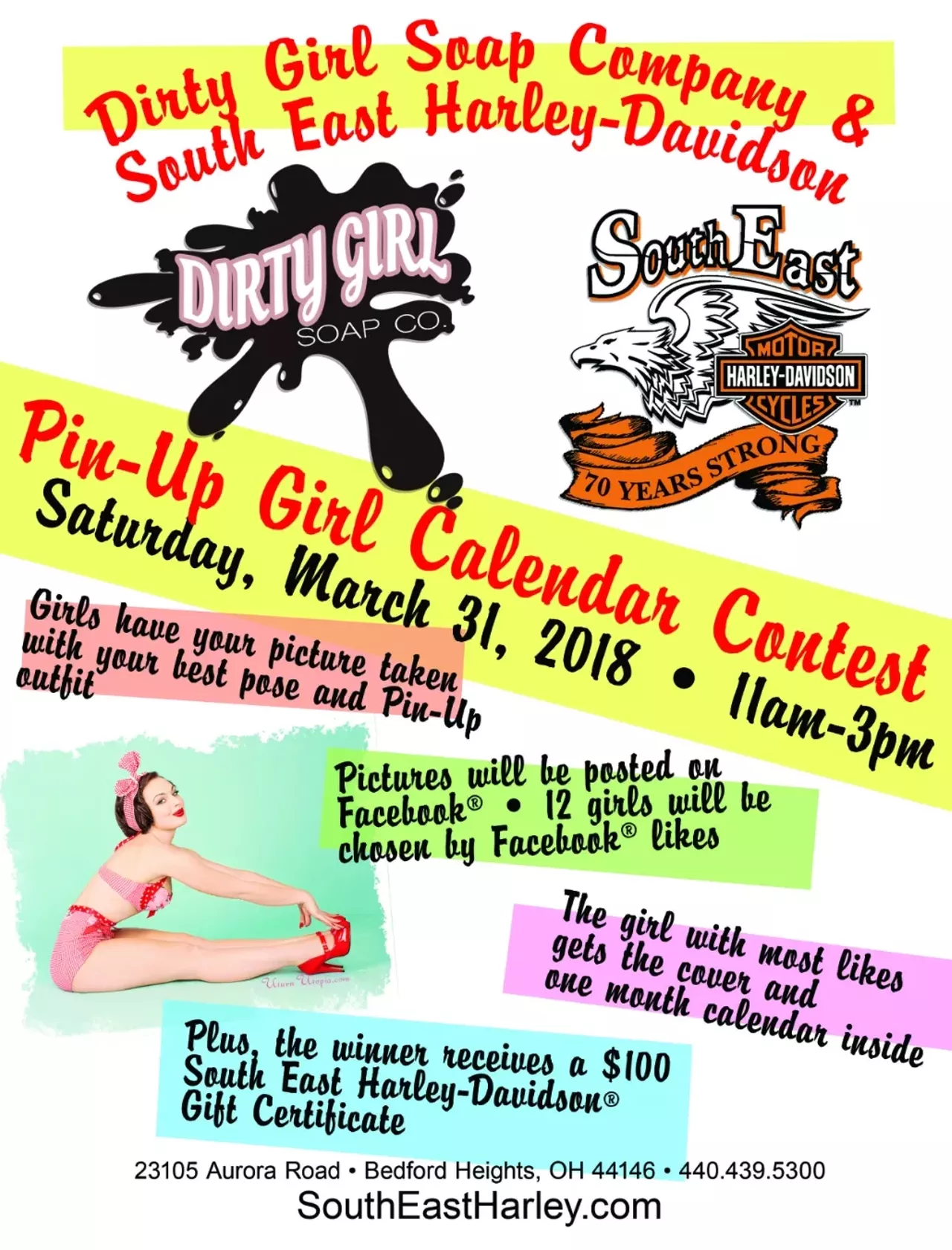 Stop by South East Harley-Davidson between 11 and 3 on March 31st to enter the pin-up contest. Pose with a Harley-Davidson bike and invite friends and family to vote the following week. Top 12 contestants will win a spot in the 2019 calendar photo shoot!