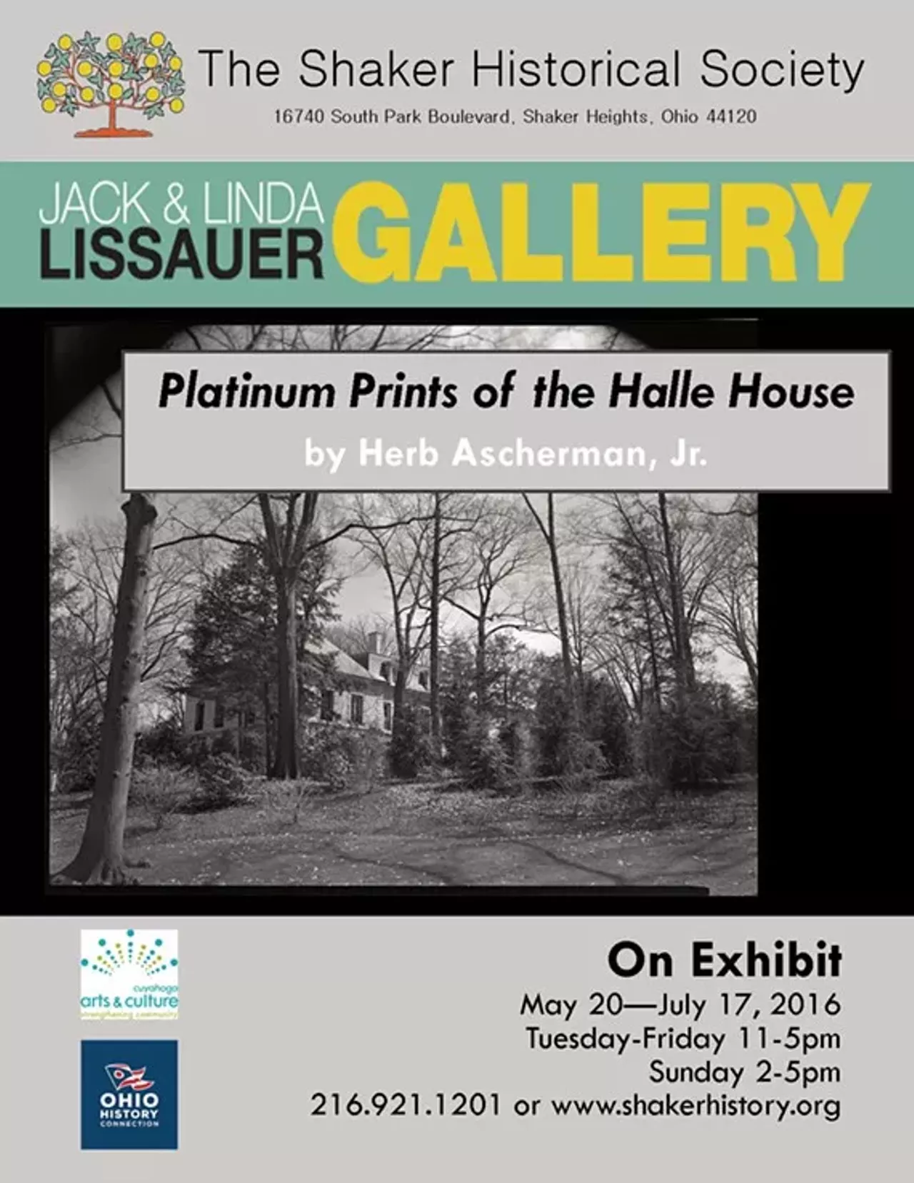 The Jack and Linda Lissauer Gallery at the Shaker Historical Society is delighted to announce the installation of “Platinum Prints of the Halle House” by Herb Ascherman, Jr. His work will be on display in the Lissauer Art Gallery from May 20 through July 17, 2016. Visit the Shaker Historical Society to see these breathtaking works in person. Herb Ascherman, Jr. is an internationally respected fine art photographer who is known for his platinum print process and superb portraits. Ascherman has been working for over 40 years and examples of his photography are found in international collections around the world.