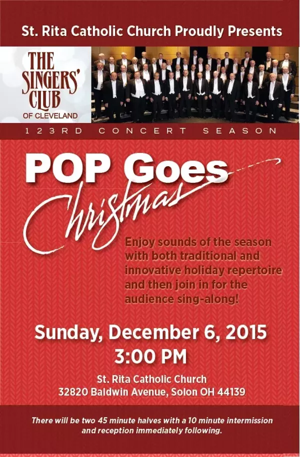 St. Rita Catholic Church Proudly Presents: The Singer’s Club of Cleveland’s 123rd Season Concert “Pop Goes Christmas!” Enjoy sounds of the season with both traditional and innovative holiday repertoire and then join in for the audience sing-along!