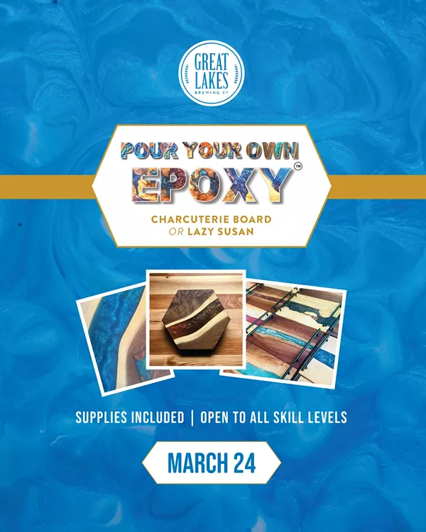 Join us at the brewpub on Monday, March 24 from 6-8PM for a Pour Your Own Epoxy class! Learn the art of epoxy and choose between making a colorful charcuterie board or lazy susan. Arrive early to mingle while enjoying Great Lakes brews, and pick your project colors!