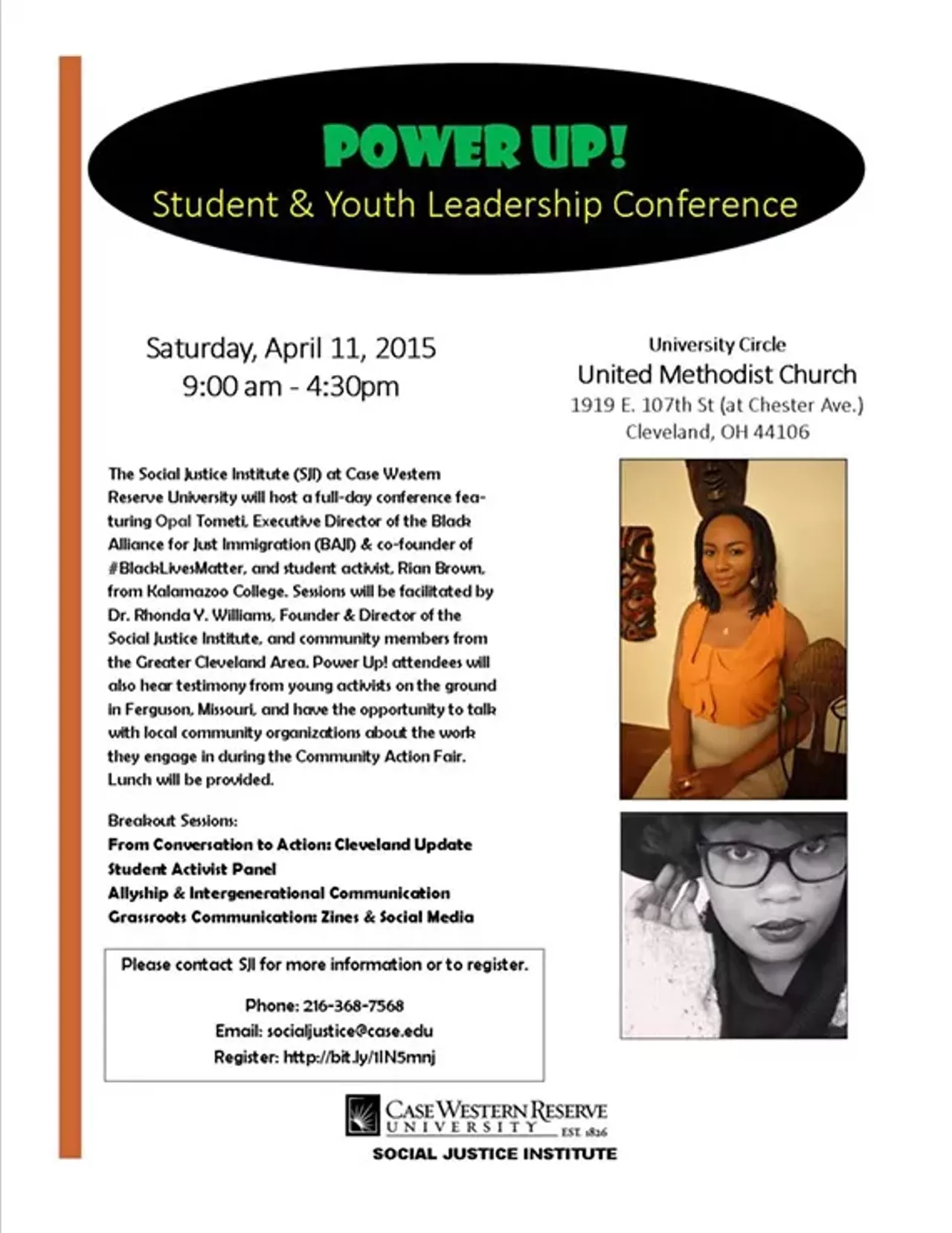 The Social Justice Institute (SJI) at Case Western Reserve University is excited to announce its Spring 2015 Student & Youth Leadership Conference to be held Saturday, April 11th. The full-day conference will feature Opal Tometi, Executive Director of the Black Alliance for Just Immigration (BAJI), and co-founder of #BlackLivesMatter. Ms. Tometi, along with student activist, Rian Brown, Kalamazoo College, will kick-off the conference with their keynote speeches.