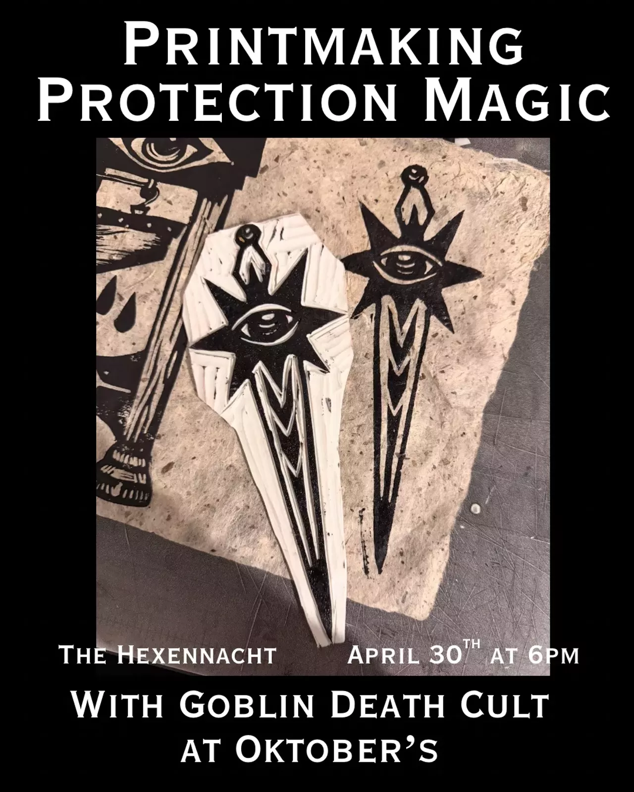 Join us for The Hexennacht on Thursday, April 30th for a night of printmaking and protection magic! Jacqui, the printmaker and artist behind @goblindeathcult will be teaching the basics of block printing — you’ll learn how to carve and print your own 4x6 block to create your own stamp for a protection talisman. All printmaking tools will be provided, and if you need a little guidance or inspiration for your image- we’ve got you! You’ll go home with your block, the print(s) you create, and some new skills. Beginners are encouraged. See you there!