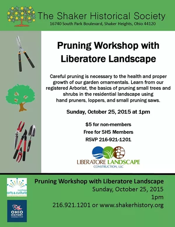 The Shaker Historical Society invites you to a Pruning Workshop with Liberatore Landscape. Careful pruning is necessary to the health and proper growth of our garden ornamentals. Learn from our registered Arborist, the basics of pruning small trees and shrubs in the residential landscape using hand pruners, loppers, and small pruning saws.