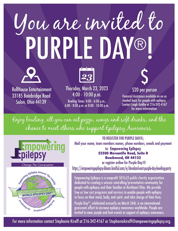 Join Empowering Epilepsy for our Annual Purple Day® Bowling Party at RollHouse Entertainment of Solon on Thursday, March 23, 2023 from 4:00 - 10:00pm.