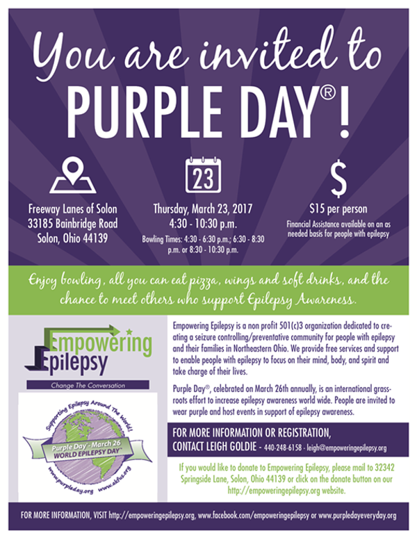 Join Empowering Epilepsy for our 3rd Annual Purple Day Party. Enjoy 2 hours of bowling, all you can eat pizza, wings and soft drinks and the chance to meet others who support epilepsy awareness. Purple Day is an International Epilepsy Awareness Day started by a then 9 year old girl in Canada to promote epilepsy awareness and understanding. Empowering Epilepsy is a non profit 501(c)3 public charity organization whose mission is to enable people with epilepsy to take charge of their lives.