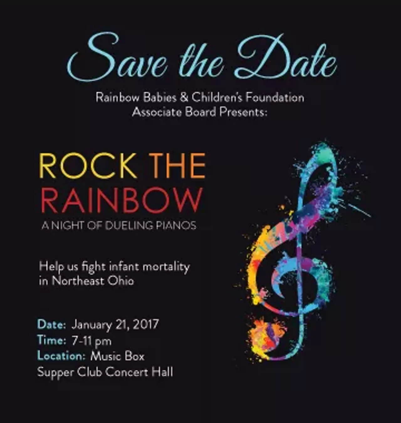 Join the Rainbow Babies and Children’s Foundation Associate Board for a night of dueling pianos at our 2nd Annual Rock The Rainbow Benefit on January 21, 2017 at Music Box Supper Club and help us raise funds for the children of Northeast Ohio to decrease this area's infant mortality rate.