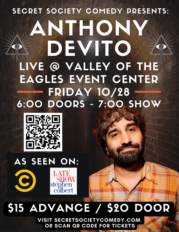 Head into the weekend on a high note with Anthony DeVito (Comedy Central, Colbert) as Valley Of The Eagles and Secret Society Comedy bring one of NYC's funniest up-and-coming comedians to Elyria with NEOH's only pop-up comedy club experience. Doors open at 6:00, give the password, grab dinner and a drink, laugh off those calories, and get in on the Secret so you can say you saw Anthony BEFORE he blows up. Tickets are $15 in advance, $20 at the door. *Rated R.* Learn more at secretsocietycomedy.com