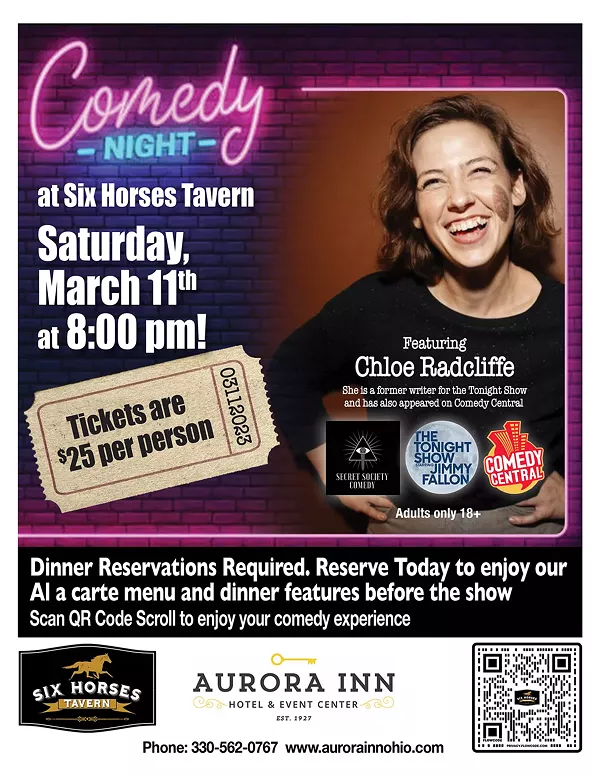 Secret Society Comedy pops up in Aurora for a memorable night of laughs, transforming Six Horses Tavern into an intimate comedy club experience with headliner Chloe Radcliffe. Based in NYC, Chloe has appeared on Comedy Central, as a writer for The Tonight Show with Jimmy Fallon, she was named a TBS Comic To Watch at the New York Comedy Festival, and is currently touring clubs and venues across the country. Tickets must be purchased in advance under 'EXPERIENCES' at https://www.opentable.com/r/six-horses-tavern-aurora. You may also call Six Horses Tavern to reserve. 18+ please.