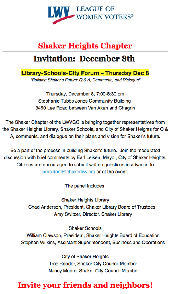 Shaker Library-Schools-City Forum – Thursday Dec 8 Building Shaker’s Future: Q & A, Comments, and Dialogue