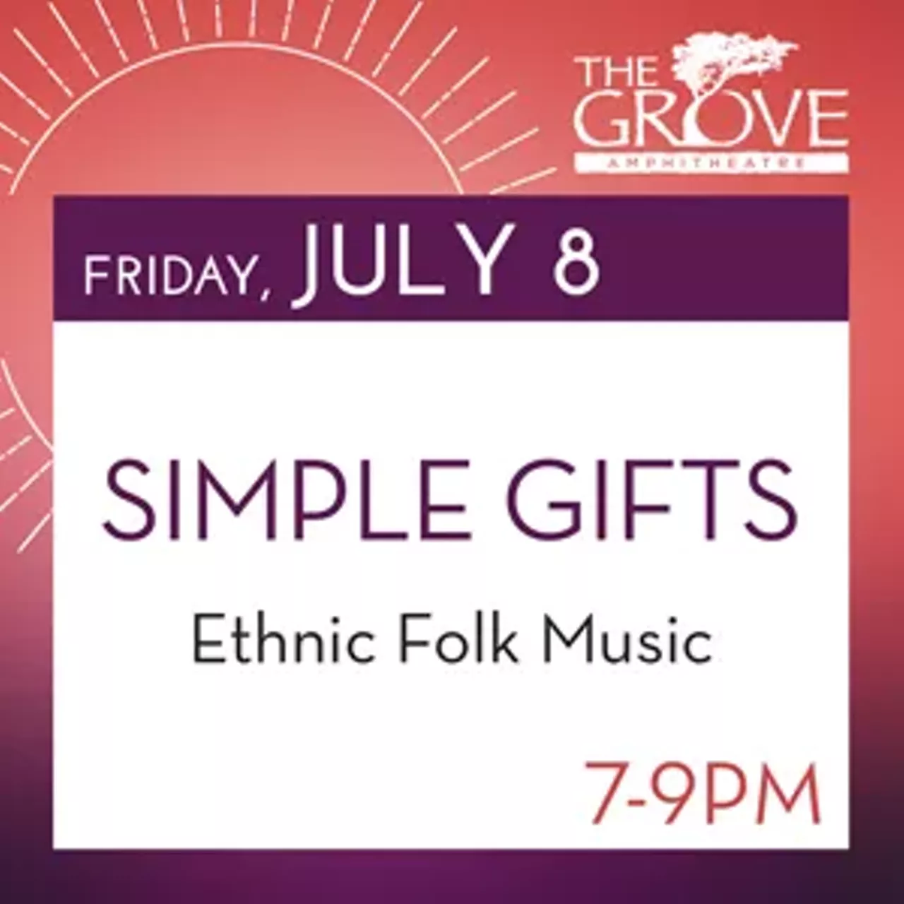 Come see Simple Gifts take the stage at the Grove. Drawing on an impressive variety of ethnic folk styles, this award-winning trio plays everything from lively Irish jigs and down-home American reels to hard-driving Klezmer frailachs and haunting Gypsy melodies, spicing the mix with the distinctive rhythms of Balkan dance music, the lush sounds of Scandinavian twin fiddling, and original compositions written in a traditional style.This is an act not to be missed!