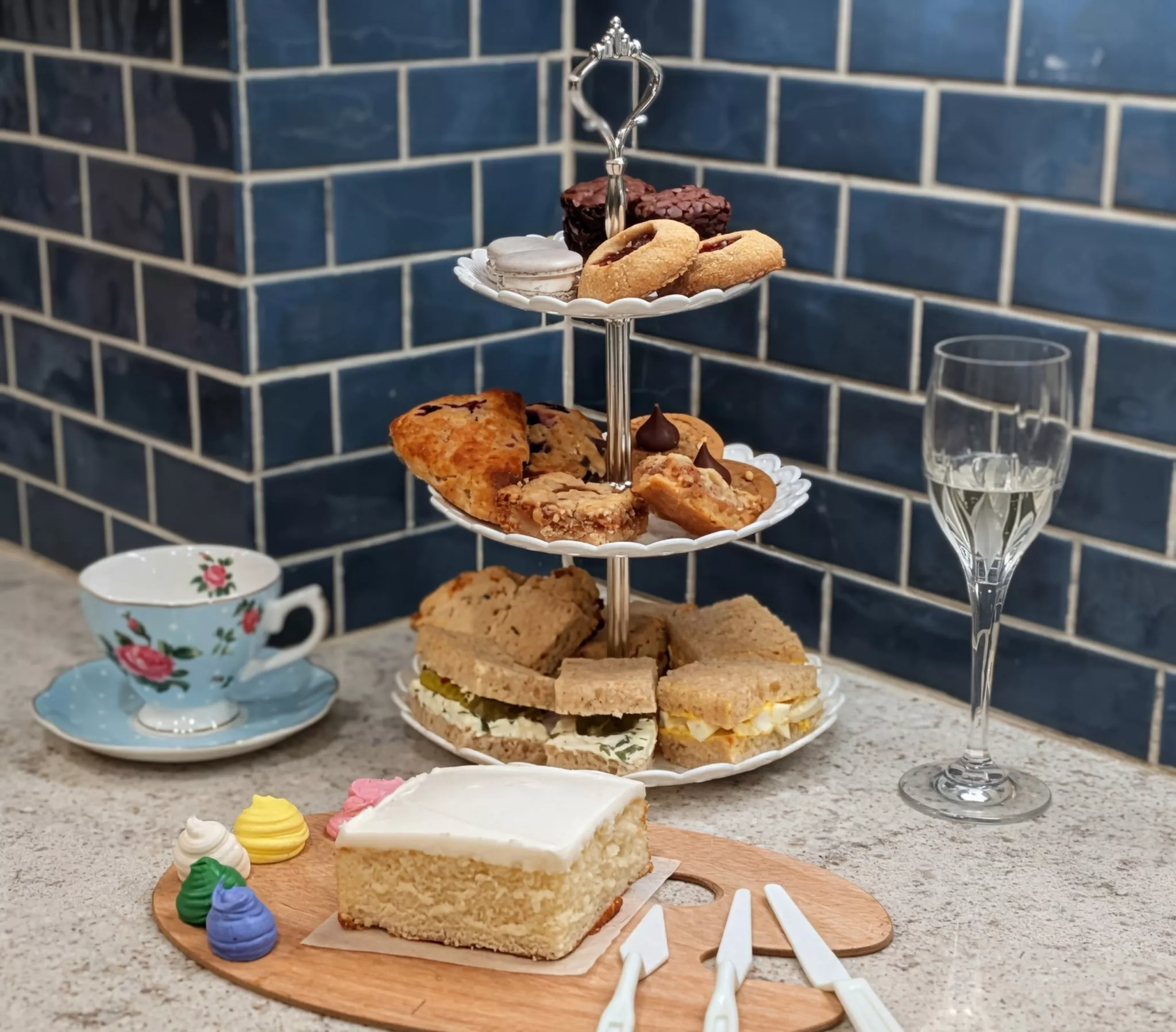 Each pair will enjoy an arranged tower featuring: Lavender honey macarons, Thumbprints, peanut butter blossom cookies, salted caramel butter bars, Blueberry scone, cheddar & chive scone, cucumber cream cheese sandwich, egg salad sandwich & beverage.