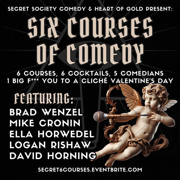 With tongue firmly in cheek, we dial the Valentine's Day dinner clichés and irreverence up to 1000 with six courses created by Heart Of Gold's Chef Daniel Racco, paired with the routines of five of the funniest comedians we could find, while you imbibe on five cocktails expertly paired with both (cocktails optional). This is an immersive and intimate culinary and comedy experience designed to make you feel like you're part of the show. Menu: secret6courses.eventbrite.com.