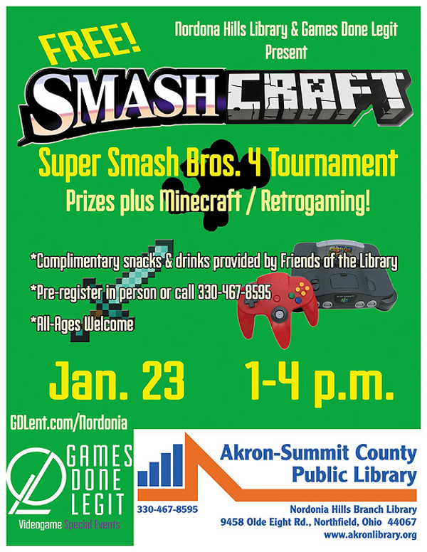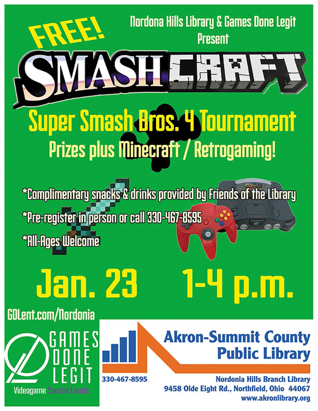 Join your fellow gamers for a Super Smash Brothers Wii U tournament with prizes. If tournament play isn’t your thing, check out the Minecraft corner and retro gaming with classics from the Nintendo 64. All ages and walk-ins welcome, but pre-registration for the tournament is strongly suggested.
