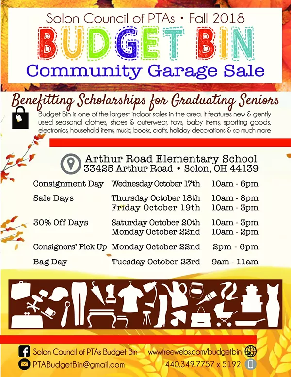 Fall Budget Bin is a Community Garage Sale hosted by the Solon Council of PTAs.