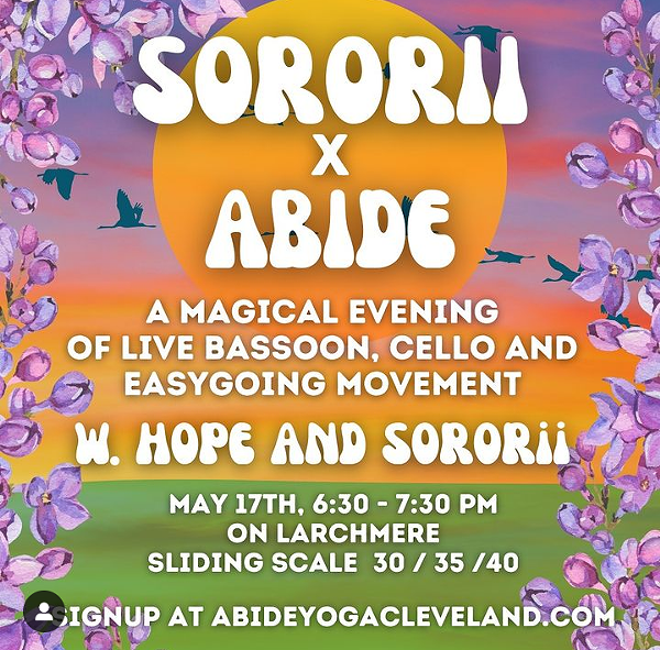 Join Cleveland’s world-indie duo, Sororii and Hope Hamling, teacher at Abide Yoga, for a beautiful evening of cello, bassoon, vocals, and easygoing movement. Meaning sisterhood, Sororii invites soul-seekers to join in friendship to connect with their inner feminine and celebrate our shared humanity across cultures.