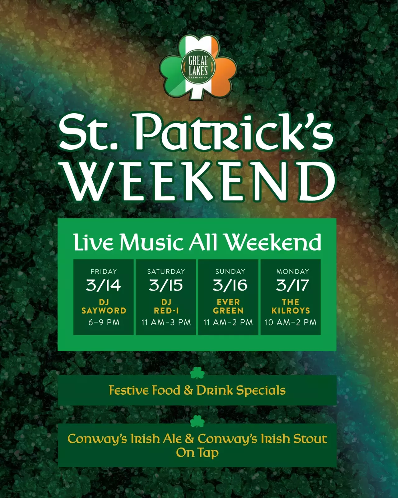 Join us at the brewpub to celebrate St. Patrick's Day Weekend! We'll have live music, festive food and drink specials, Conway's Irish Ale and NEW Conway's Irish Stout flowing on the taps, and our St. Paddy's Party Pub pop up in the beer cellar. Plus, we're hosting the Post-Race Hooley Celebration for the St. Malachi Church Run! See full entertainment schedule below.