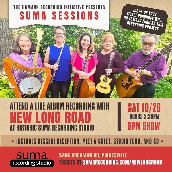 Attend a live album recording with New Long Road at historic Suma Recording Studio. This is a unique opportunity for you to watch an actual recording session and experience a concert by this new folk-rock-jazz-classical group. New Long Road is a unique band, consisting of three singers, a flute, a cello, and combinations of guitars, banjo, Celtic harp and ukulele. 100% of your ticket purchase will go toward funding this recording project. All tickets include Admission to Live Performance/Recording, Dessert Reception, Meet-N-Greet with the Band, Studio Tour, and a copy of the finished album on CD. Doors 5:30, Show 6pm.
