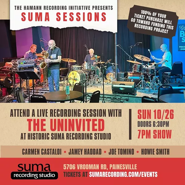 Attend a Live Recording Session with The Uninvited (Carmen Castaldi, Jamey Haddad, Joe Tomino, Howie Smith) at Historic Suma Recording Studio! The variety of their backgrounds and individual musical experiences, along with the non-conventional instrumentation, leads to music that has the possibility to go in any direction – or multiple directions – at any time.