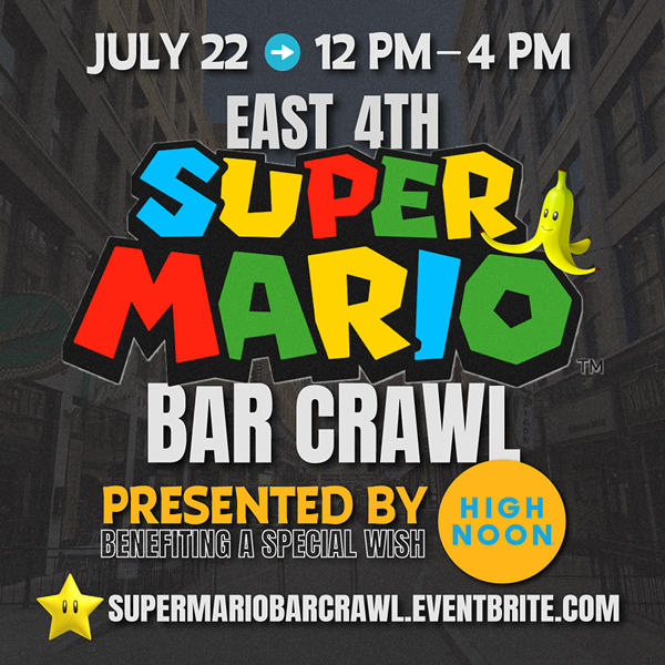 The Super Mario Bar Crawl presented by High Noon will take place from 12:00 p.m. – 4:00 p.m. at participating East 4th bars including Geraci’s Slice Shop, Barrio Tacos, GOMA, Society Lounge, Butcher and the Brewer, The Corner Alley and Flannery’s Pub. The $20 ticket includes a hat, ID badge, and access to Super Mario-inspired drinks and activities. Bar crawlers are encouraged to dress up in a Super Mario-inspired outfit. The best dressed attendees will receive a prize at the trophy ceremony. 100% of the proceeds from the event will benefit A Special Wish NEO!