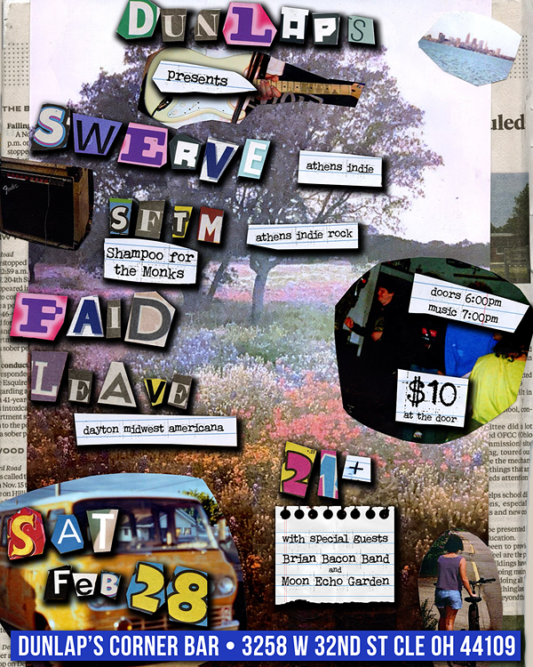 Cleveland mark your calendars! Swerve is coming in hot with a 5 band bill featuring bands from just about every corner of Ohio. Featuring music from Swerve, Shampoo for the Monks, and Paid Leave, and special guests Brian Bacon Band and Moon Echo Garden.