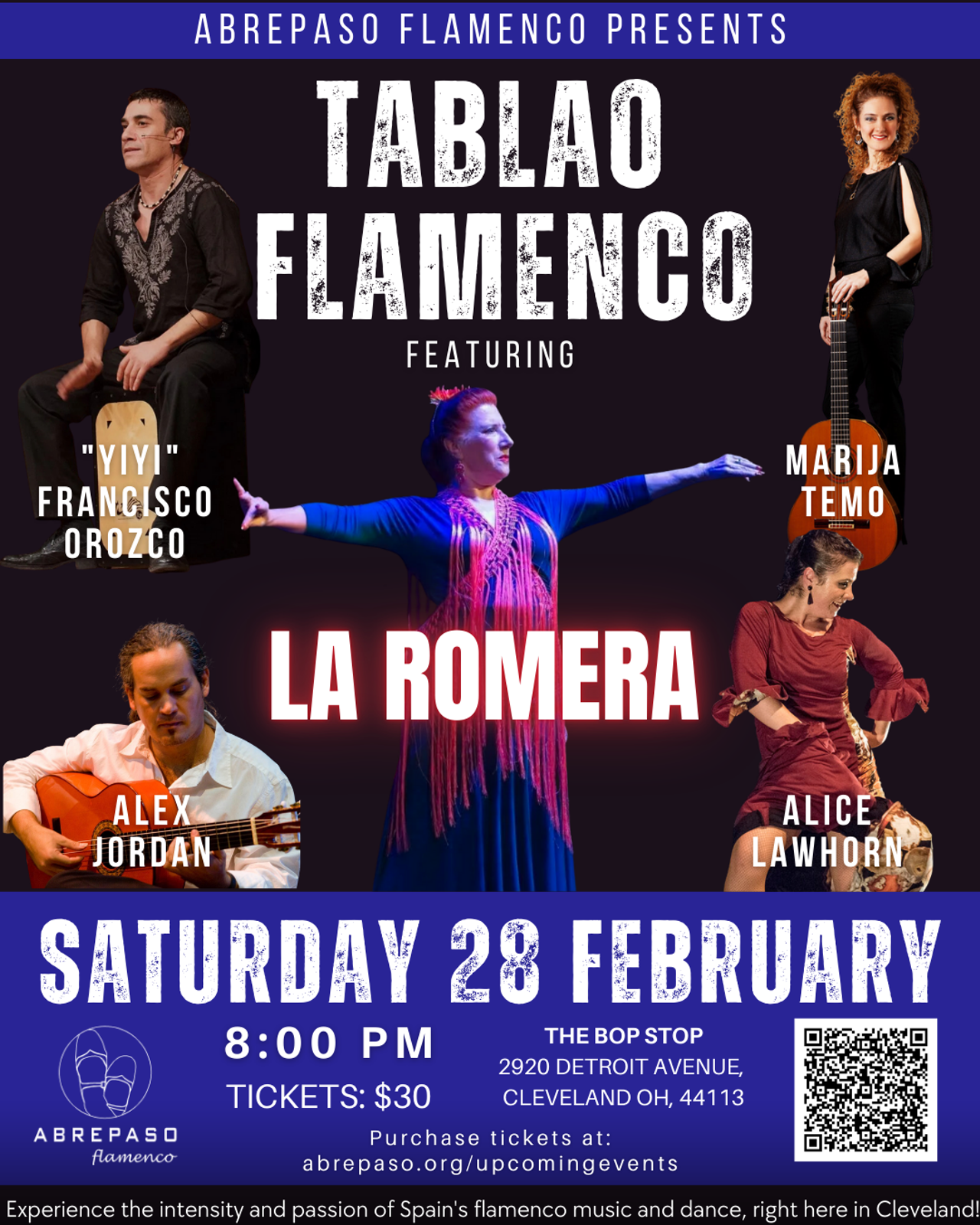 Experience an evening rooted in tradition and brimming with the spontaneity and passion that define flamenco with some of the best flamenco artists from around the globe: Alex Jordan (guitar, Cuba), "Yiyi" Francisco Orozco (singing, Spain), Marija Temo (singing, U.S.), La Romera (dance), Alice Lawhorn (dance), and Abrepaso’s community performance group - En Camino. This event brings the heart of flamenco to life with live music and dance.