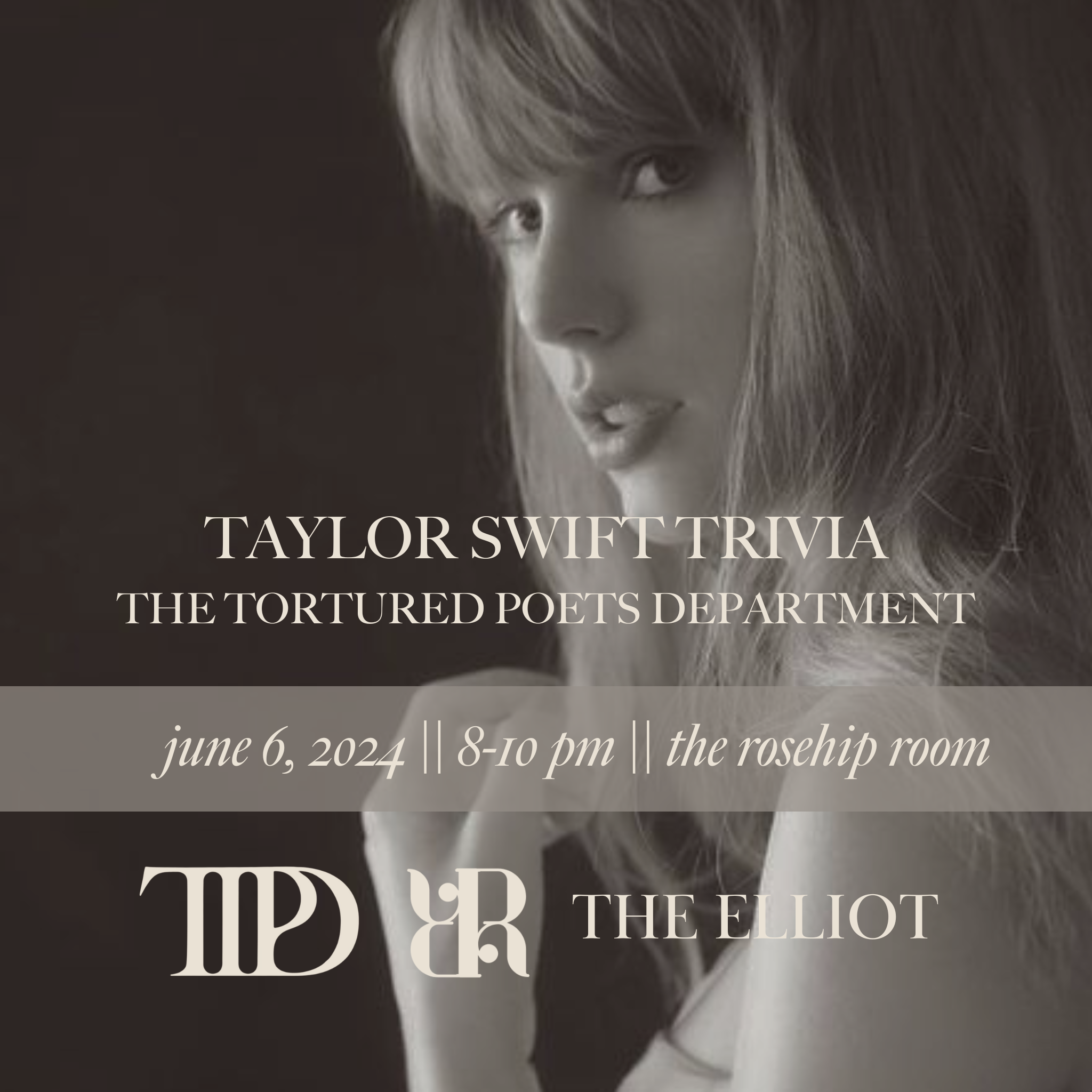 Grab your Swifties and join us in the Rosehip Room at The Elliot for a night of all things Taylor: trivia, prizes & themed drinks.