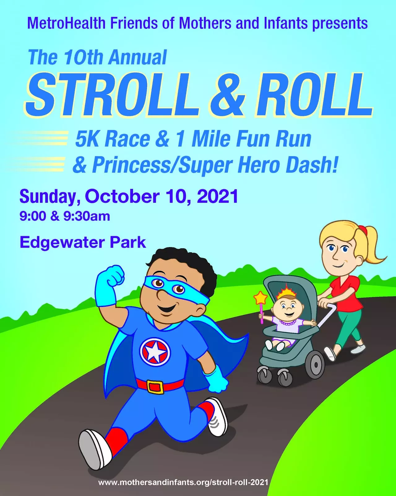 The 10th Stroll & Roll 5K Race & 1 Mile Fun Run at Edgewater Park 10/10/21 at 9:00am. Princess and Super Hero Dash for the kids!