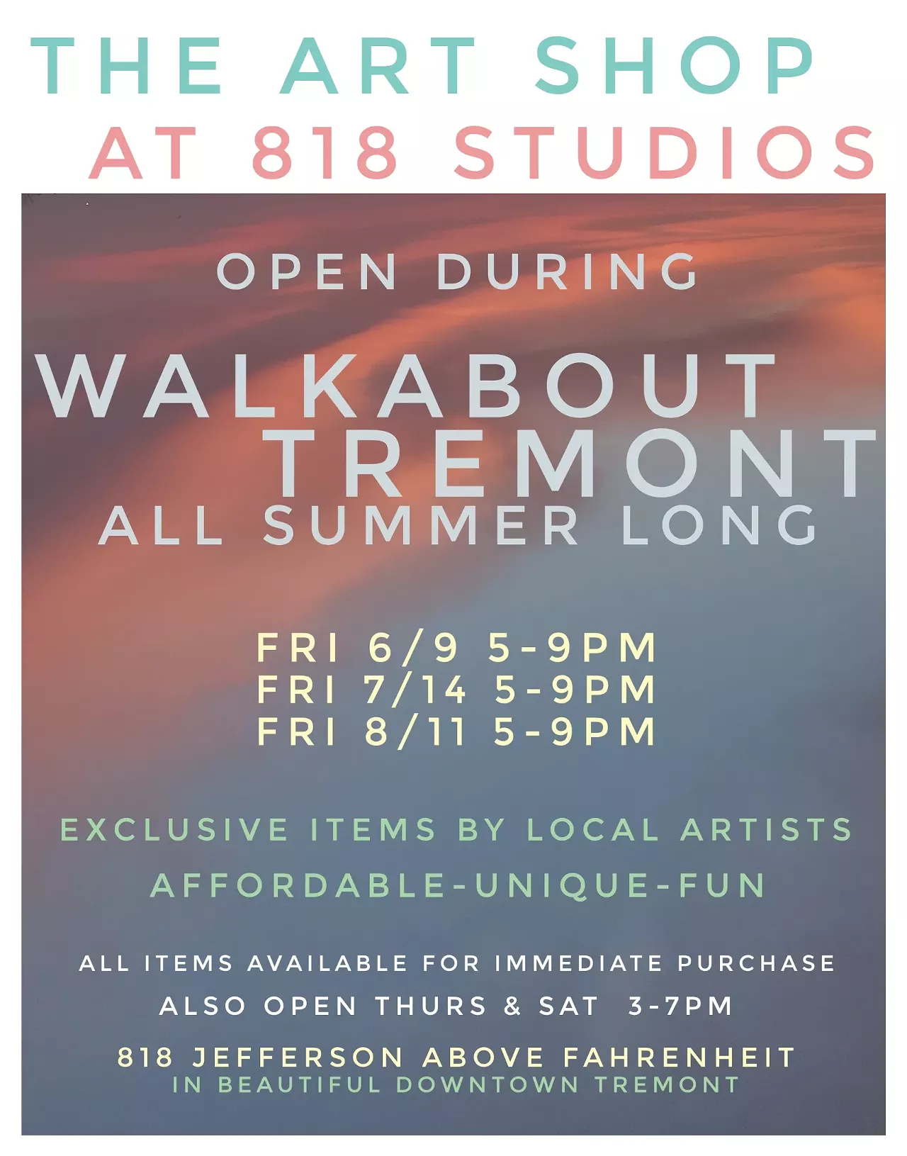 Join us this summer for the ART SHOP AT 818 STUDIOS. 20+ artists will showcase their work throughout the entire summer during Walkabout Tremont. Everything from fine art paintings and hand made jewelry to artisan soaps and handmade gifts will be available for immediate purchase. This is an ongoing art shopping experience that will be on view June 9, 2023 thru August 11, 2023. Artists include Dott Von Schneider, Ron Kretsch, Bryon Miller, Rhonda Bartos, Barbara Merritt, Gina DiSantis, Karen Petkovic, Rebecca Yody, and many more. Add'l hours: Thurs & Sat 3-7pm