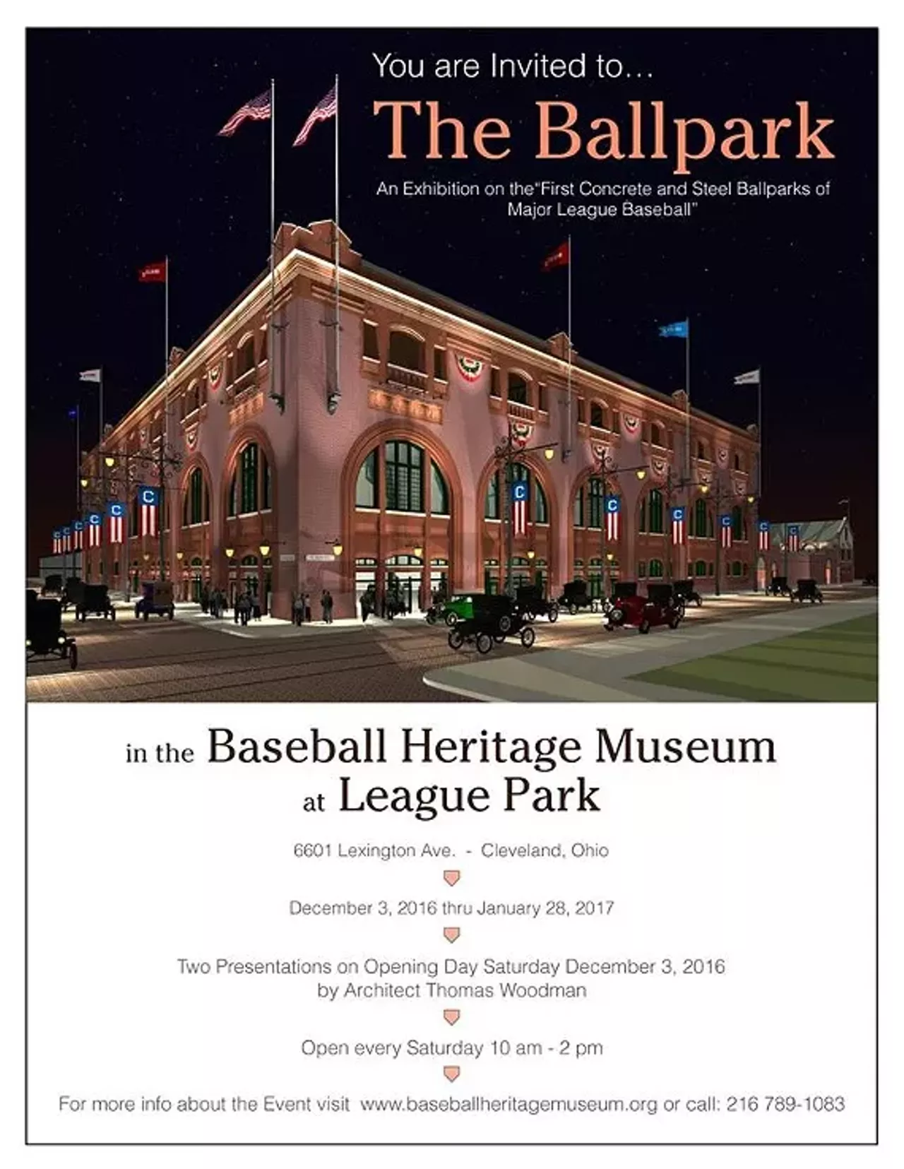 The Baseball Heritage Museum announces the opening of “The Ballpark – An Exhibition on the First Concrete and Steel Ballparks of Major League Baseball,” including two presentations by the artist, on Saturday, December 3, 2106.