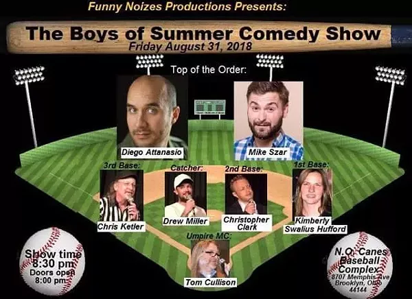 The Boys of Summer Comedy Show with Top of the Batting OrderDiego Attanasio and Mike Szar . In the field we have Kimberly Swalius Hufford on 1st Base, Christopher Clark on 2nd Base,Chris Ketler (aka The Bitter Dude) on 3rd Base and Drew L Miller at the Catcher position. Our Umpire tonight is MC/Host Tom Cullison.