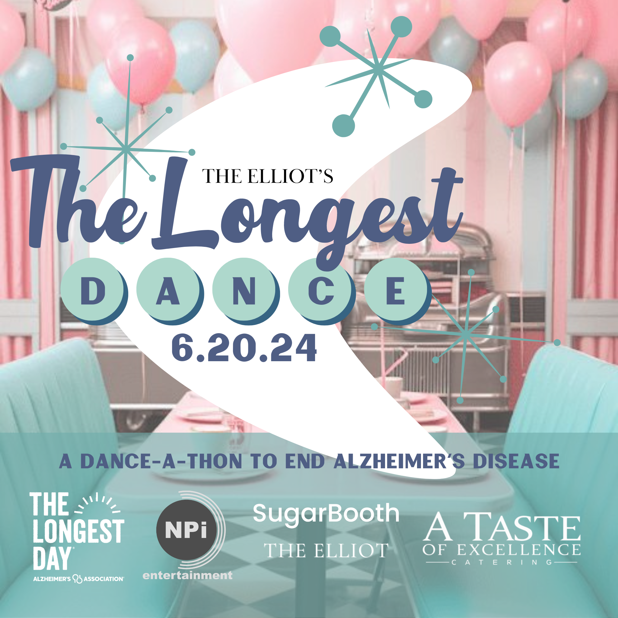 The Elliot is transforming its ballroom into a 1950s diner & hosting a dance-a-thon to raise funds and awareness for the Alzheimer's Association! Teams will compete from on The Longest Day, June 20th. The team that follows the rules, remains standing, and earns the most points will be awarded a free event at The Elliot!