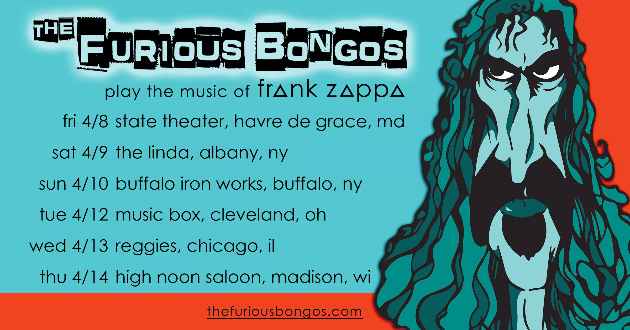 Live music is back and so are The Furious Bongos! This fiery band is making a long-awaited return to many of their favorite venues to celebrate the mother of all musicians: Frank Zappa. They've been cooking up some spicy new tunes, so pass your plate on down and grab some hot meat... or a hot rat if that's what you're into. There’ll be muffins, and perhaps some tiny cookies to keep you sated while worshipping the Grand Wazoo.