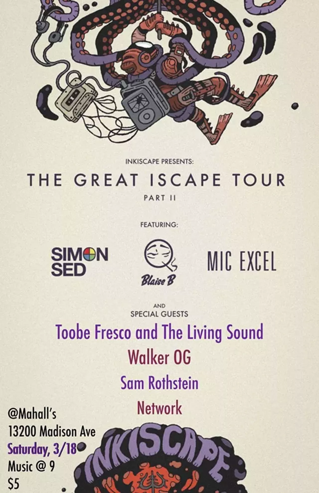 Cleveland artist, Simon Sed is on tour with Blaise B. (Chicago, IL) and Mic Excel (Buffalo, NY). On Saturday, March 18th the trio will be joined by local artists, Walker OG, Toobe Fresco and The Living Sound, Network, as well as Sam Rothstein (Columbus, OH) to bring you a bill loaded with talent from near and far. Come witness indie hip-hop at its finest!