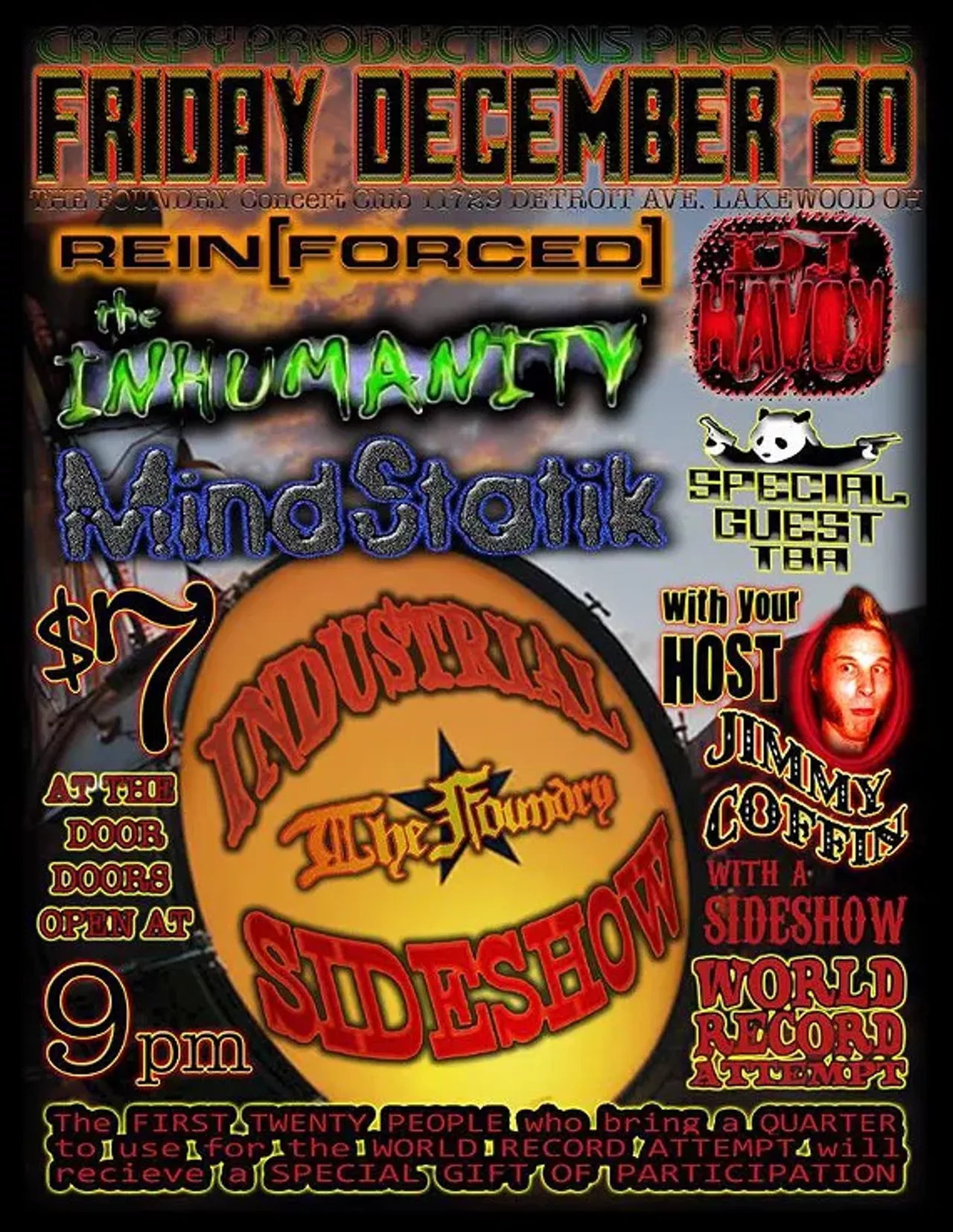 We are bringing in some of the best industrial bands from the region and combining them with the antics of one of the best side show performers around JIMMY COFFIN. Between some bands and closing out the night will be DJ Havok, resident DJ at REWIRED BG and Broken Glass.