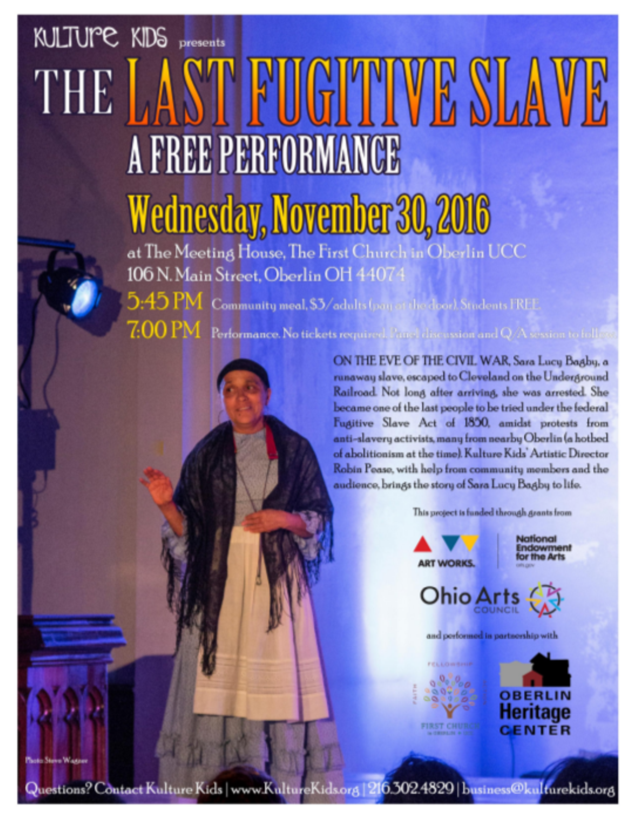 The Last Fugitive Slave, the incredible, true story from our nation's Underground Railroad past, will be presented by Kulture Kids in a FREE, participatory community performance and panel discussion on Wednesday, November 30th at 7:00PM at The Meeting House of First Church in Oberlin UCC.